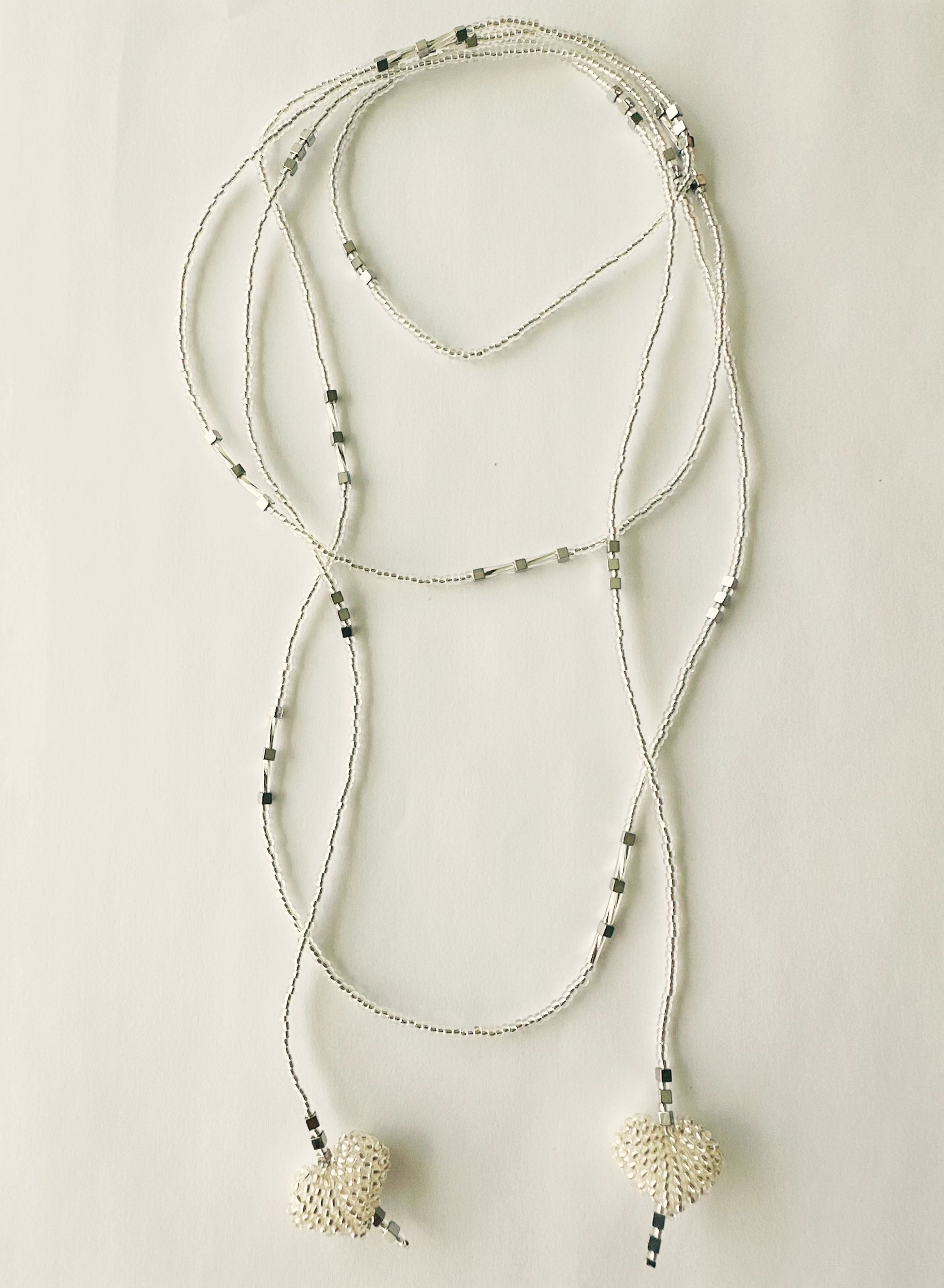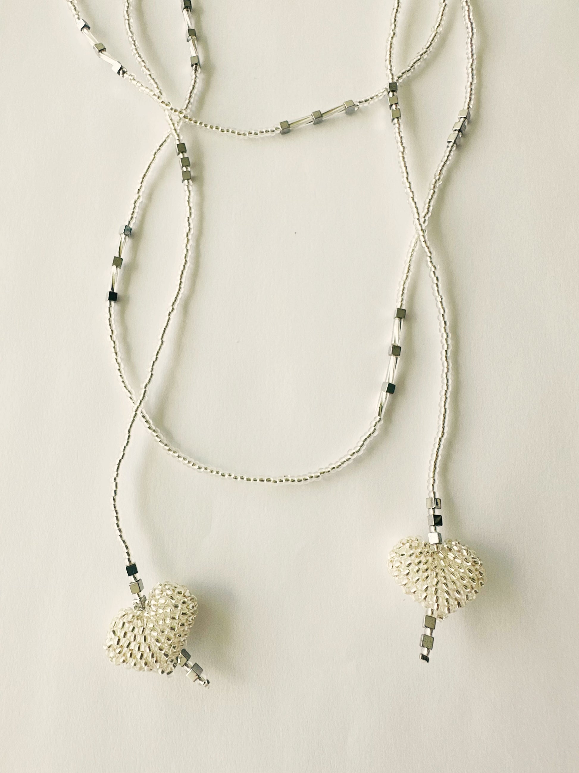 Un collar Lara y delicado de 1,50 cms de largo con miyuki en tonos plateados con detalles en piedras acerína saltonas, acompañado en las puntas con dos corazones en 3D tejidos con precisión artesanal, su diseño versátil permite usarlo en diferentes estilos y capas, convirtiéndose en un accesorio romántico y atemporal que resalta la feminidad y la esencia boho chic.